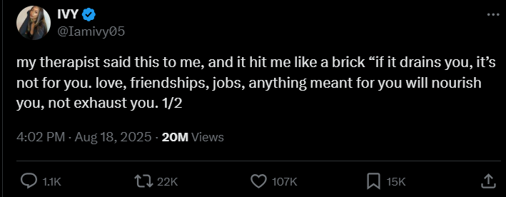 This is, obviously, a Bad Tweet. Part of the “you don’t owe anyone anything” school of thought that has permeated the Therapy Speak side of the Internet for years. The “protect your peace” folks who will protect their way to total isolation and then wonder why it is that they’re alone. Selfishness wearing the muted trappings of self-care. Don’t do anything you don’t wanna do. Stay in bed and cancel plans every other weekend if you feel called to do so, never mind that people are relying on you. Because mental health.