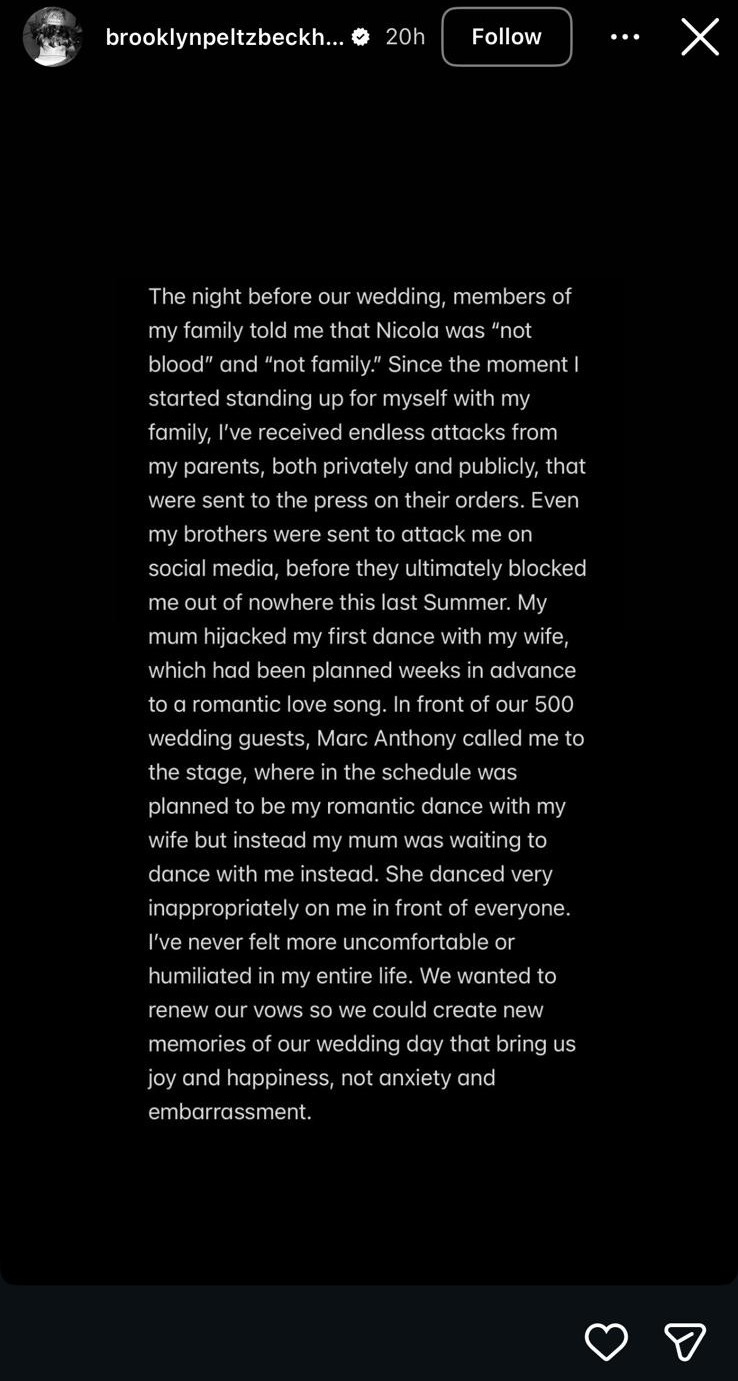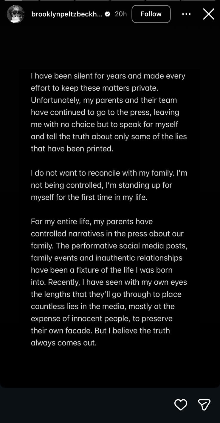 But then Brooklyn Beckham, a person I’m only aware of due to the twin powers of alliterative names and famous parents, decided to open his little Notes app and call a shockingly loud j’accuse on his family. And you know what, I’m not too proud to say that I sat up. I did! Like all of us, I’ve been despairing as ICE has fully assumed its Gestapo identity and wreaked havoc on Minnesota and the rest of the country; waking up every day wondering what nation America will be attacking or threatening to attack today; and losing my mind as public health continues its downward slippery slope led by RFK Jr’s wormed-out brain.
