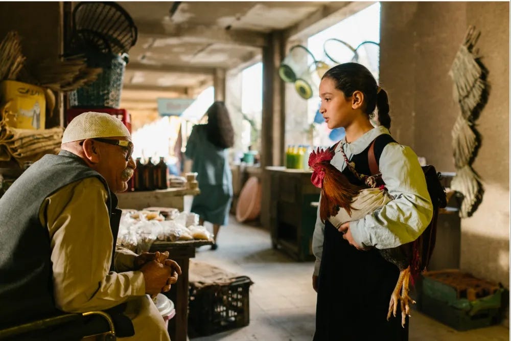 And it is this mission that the film takes us on: Lamia, the schoolgirl tasked with the baking of Saddam’s cake, goes on a heroine’s quest alongside the requisite side characters that include the aforementioned rooster (Hindi is his name btw and do not forget!), her best friend and neighbor Saeed, her grandmother Bibi, and a gregarious, frequently life-saving driver.7 There are bureaucratic nightmares to contend with, yes, and petty abuse of small positions of power, along with a particularly nefarious character, but for the most part we are led to believe—maybe to hope—that Lamia will make it, whether by the grace of God, her own determination, or the kindness of strangers.